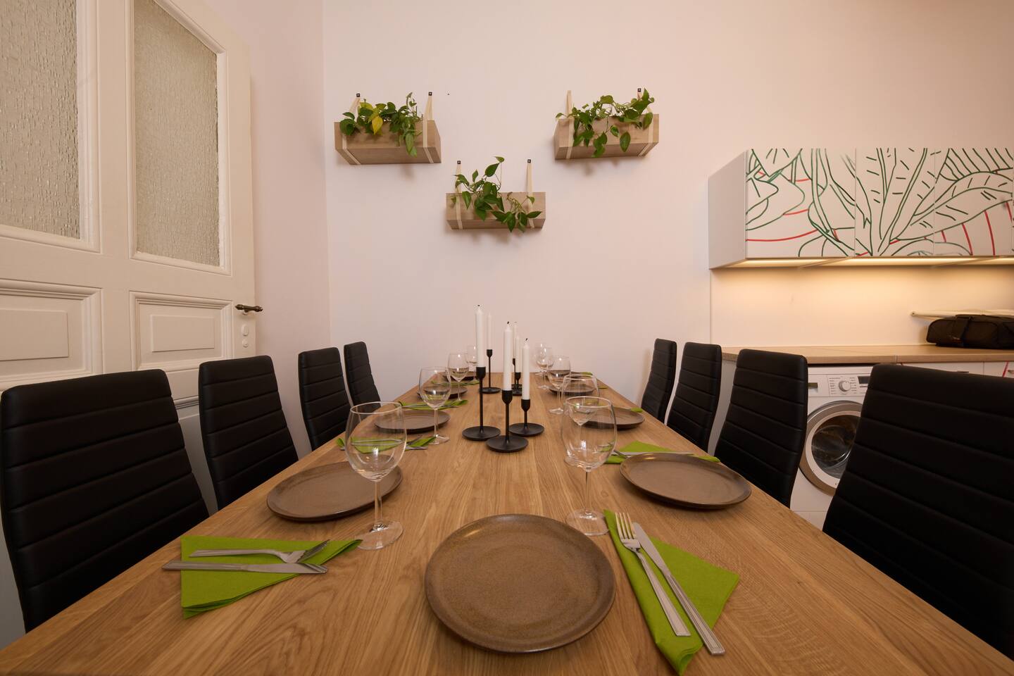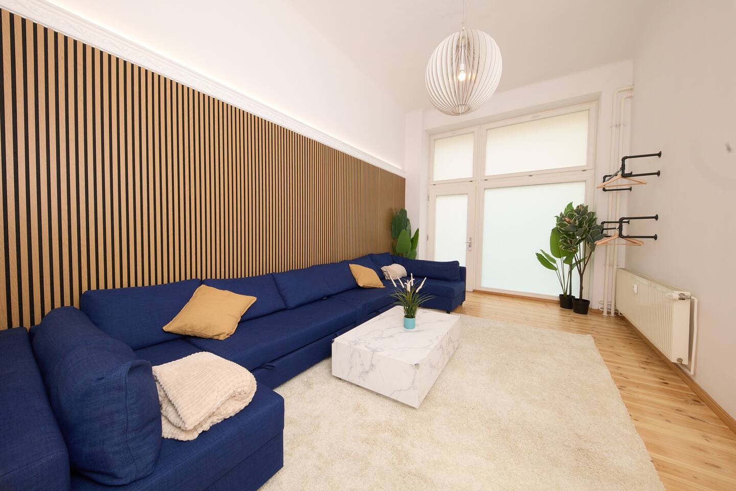 Unsere stilvolle Wohnung – Dein Zuhause in Berlin! Unsere modern eingerichtete Wohnung bietet alles, was du für einen perfekten Aufenthalt brauchst – und dazu noch jede Menge Platz: Hinweis für größere Gruppen: Bei voller Auslastung mit 12 Personen wird die Wohnung etwas enger, aber dank der cleveren Raumaufteilung bleibt der Komfort erhalten. Für kleinere Gruppen (bis 10 Personen) bietet die Wohnung jedoch besonders viel Platz und Entspannung. Schlafbereich: → 4x Queen-Size-Betten (1,60 x 2,00 m) mit hochwertigen Boxspringmatratzen → 2x Schlafsofas (1,40 x 2,00 m) Wohn- & Essbereich: → Gemütlicher Sitzbereich mit großem Sofa und Beamer für entspannte Filmabende. → Essbereich mit Platz für bis zu 10 Personen – ideal für gemeinsame Mahlzeiten. Küche: → Voll ausgestattet mit Herd, Ofen, zwei Mikrowellen, Kühlschrank, Gefrierschrank, Toaster und Tassimo-Kaffeemaschine. → Alles, was du zum Kochen und Genießen brauchst, ist vorhanden. Praktische Extras: → Arbeitsplatz mit schnellem WLAN – perfekt für Geschäftsreisende. → Waschmaschine für längere Aufenthalte. → Kleines, aber funktionales Badezimmer mit Dusche. → Frische Handtücher, Shampoo, Conditioner und weitere Basics stehen bereit. Lage: → Direkt vor der Tür: Bahnhof mit bester ÖPNV-Anbindung – so erkundest du Berlin ganz einfach. Warum unsere Wohnung? Platz für bis zu 12 Personen: Ideal für Familien, Gruppen oder Geschäftsreisende. Moderne Ausstattung: Von der voll ausgestatteten Küche bis zum Beamer – hier fehlt es an nichts. Zentrale Lage: Nur wenige Gehminuten zum Schloss Bellevue und mit perfekter Anbindung an Berlins Highlights. Stay comfy, stay well! 😊